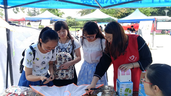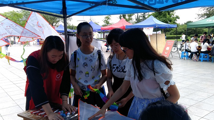 5月13日,摊位上开展的是缕缕轻丝将爱放飞的手绘风筝活动。摊位上,志愿者们放置了一定数量的简易风筝以供路人进行手绘或者书写文字。完成的风筝可由参与活动的同学带走放飞,留下的风筝则粘贴到了帐篷边沿上,吸引更多的人参与到活动中来。在风筝上,有的同学写下了自己的座右铭,有的画上了有趣的图案,内容十分丰富。