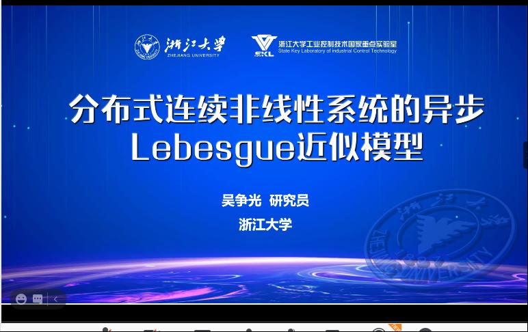 接着,吴争光老师做了题目为“分布式连续非线性系统的异步Lenesgu近似模型”的报告,该报告主要介绍了离散抽样的现状,Lenesgue 模型和传统模型的对比。最后介绍了他们团队在正在做的条件触发和无条件触发的Lenesgue近似异步算法,详细介绍了有条件触发和无条件触发的联系和区别。