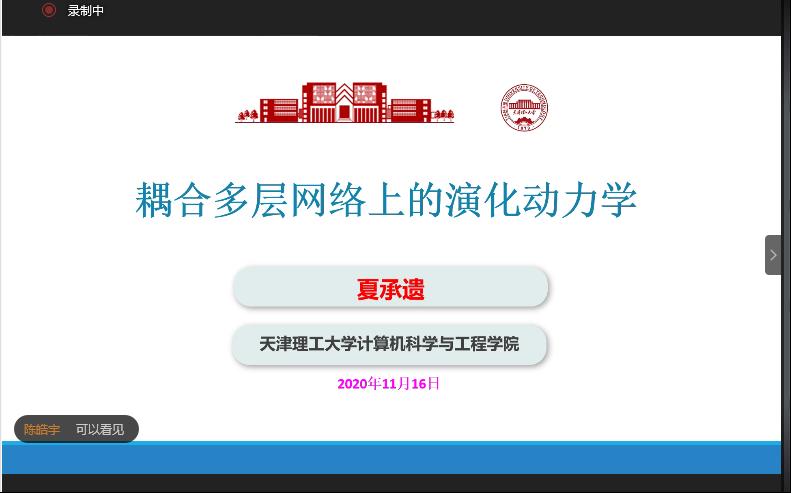 然后,夏承遗教授做了题目为“耦合多层网络上的演化动力学”的报告。该报告介绍了复杂网络的模型,并且详细了网络模型的复杂度和传播过程,最后他介绍了团队的推算的疫情扩散的网络模型。